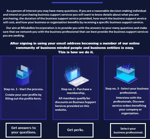 By hovering over and clicking the Business-Related Articles Button, the Business-Related Blogs Button or the Business-Related Questions Asked and Answered Buttons you will be directed to webpages where you can insert a link that directs targeted consumers to your user profile page where they can review your credentials and you can select what remote Business will be your Business Support Service provider.